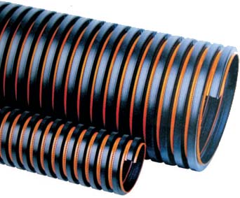 Tubo corrugado flexible espiralado, se presenta en negro con naranja.